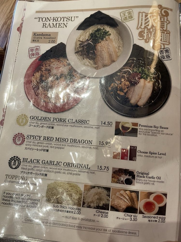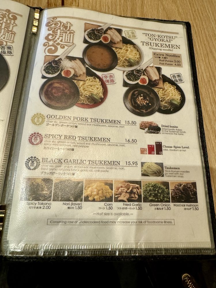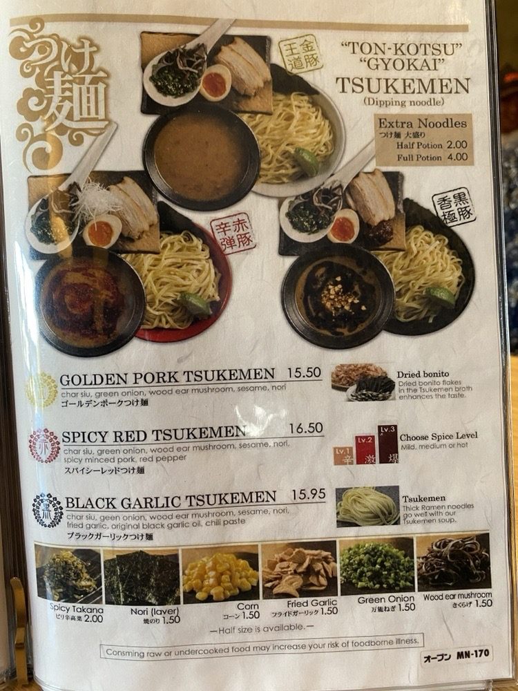 For those seeking a bolder flavor, the Black Garlic Original Ramen ($16.75) adds aromatic garlic oil and spicy chili paste, elevating the experience. If heat excites your palate, the Spicy Red Miso Dragon Ramen ($16.95) brings a delightful kick with spicy minced pork. The innovative Tsukemen options, perfect for dipping, include Golden Pork Tsukemen ($16.50) and the intense Black Garlic Tsukemen ($16.95).